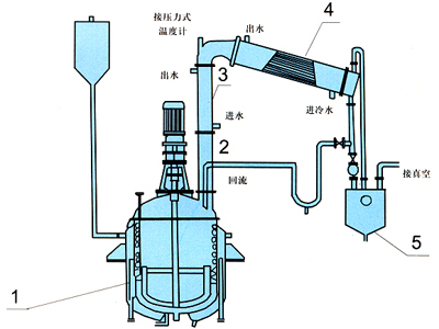 1、反應(yīng)鍋   2、豎式分餾柱   3、豎式冷凝器   4、臥式冷凝器